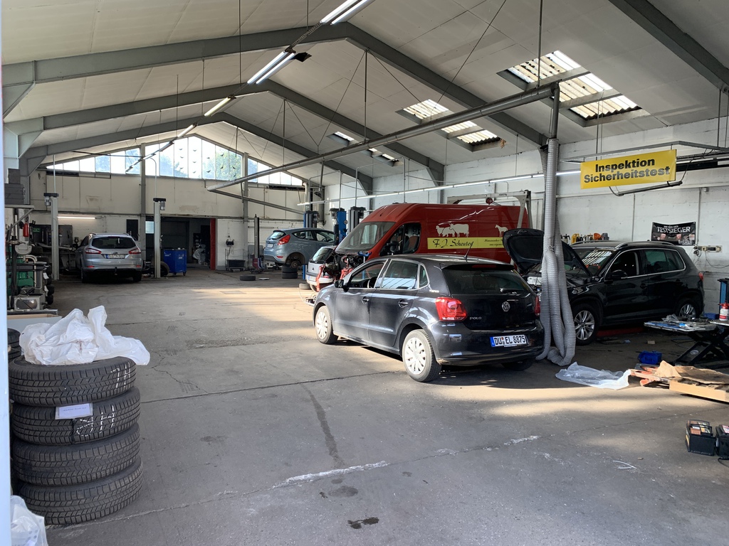Zur Werkstattanlage gehören u.a. eine große Fahrzeughalle mit 4 Hebebühnen, ein Lager sowie das Büro.